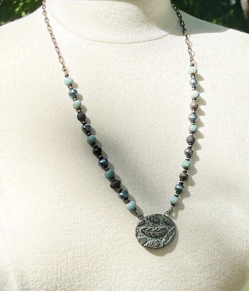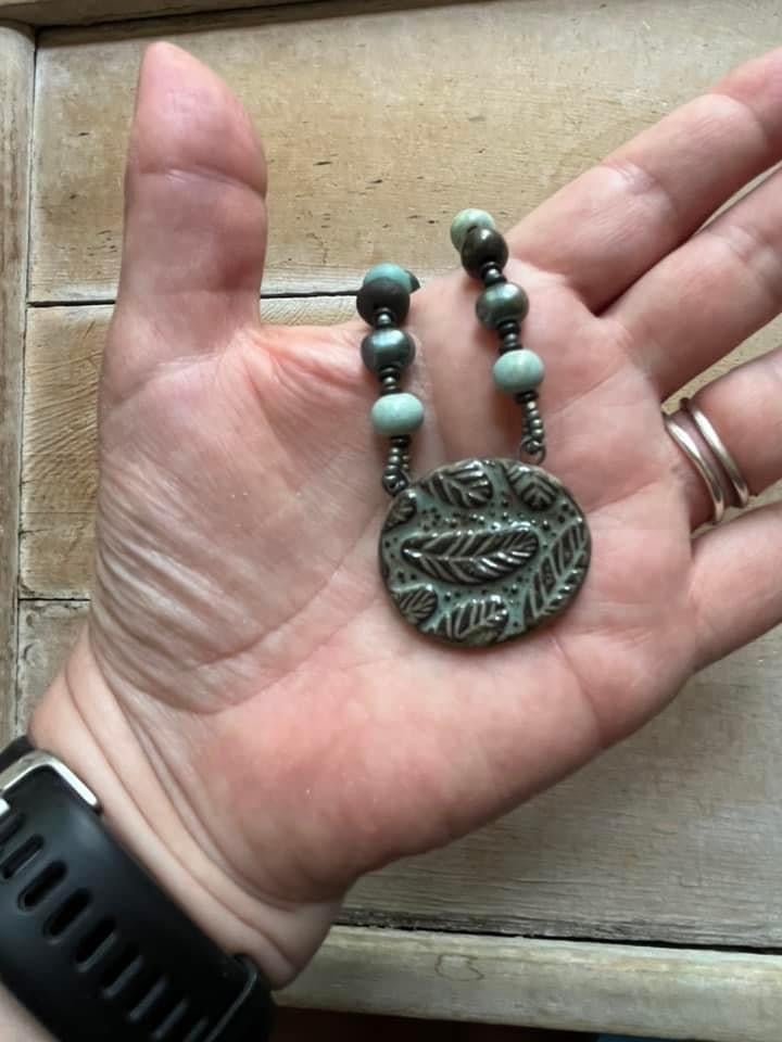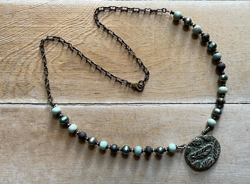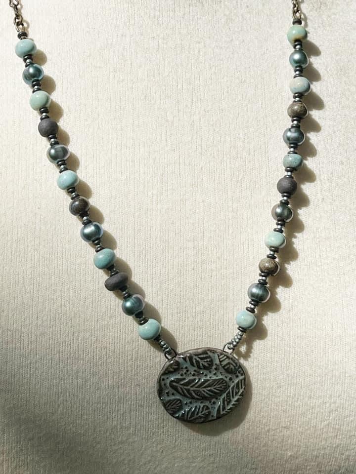 As a child I was fascinated by feathers. The most prized were the blue ones. I still enjoy finding them. This necklace features a ceramic pendant and beads from Gaea in coordinating blues and deep brown black. I chose freshwater pearls in a lovely blue peacock shade to add depth. Brass chain finishes off the back. Length is 24 inches with the pendant being another inch. If you like the clasp is able to connect to the chain loops so you can shorten to another length.